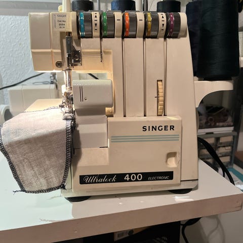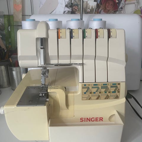 Singer 14SH754 overlocker symaskine i hvid. Maskinen har fire trådspændinger og er egnet til overlock-syning af kanter og sømme i forskellige stoftyper. Der medfølger strømkabel og instruktionsmateriale, som ses på billederne. Velegnet til både simple overlock-opgaver og mere avanceret syning med flere tråde.
