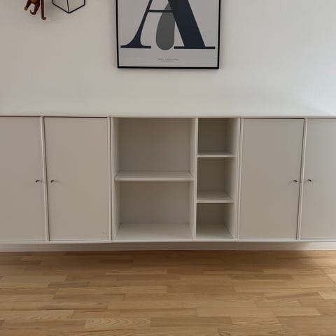 4 låger med hylder i og 4 skuffer. Alle med soft close