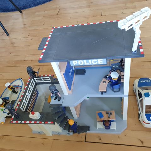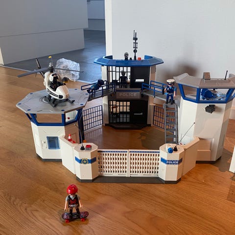 Sættet forestiller en større politistation med porte, fængselscelle, vagttårne og kontrolrum. Der medfølger flere figurer, herunder politibetjente og fange, samt forskelligt tilbehør som værktøj, møbler og udstyr til politiarbejde.