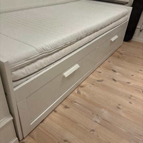 IKEA dagbed i hvid med tre integrerede skuffer under liggefladen. Sengen har høj ryg- og sidekant med lodrette paneler og lamelbund i træ. Velegnet som enkeltseng eller sofa i f.eks. børneværelse, gæsteværelse eller stue, med ekstra opbevaringsplads i skufferne til sengetøj eller andre ting.