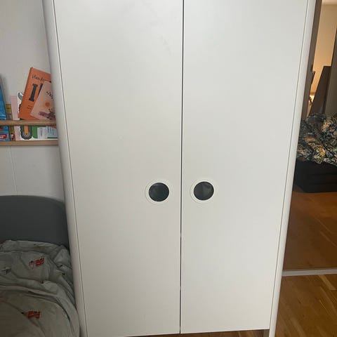 IKEA BUSUNGE børneskab i hvid. Skabet har to låger med runde greb og er indrettet med tre hylder, som giver plads til opbevaring af tøj eller andre ting.
