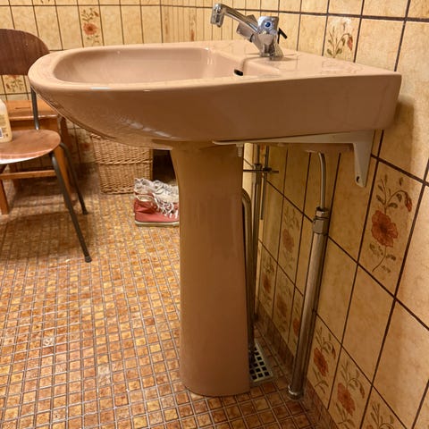 Fed vintage porcelæns håndvask med fritstående søjlefod. Udstyret med to armaturhuller og overløb og armatur til koldt og varmt vand. Fed grøn farve (der er kun en vask - spejl bagved ;-)