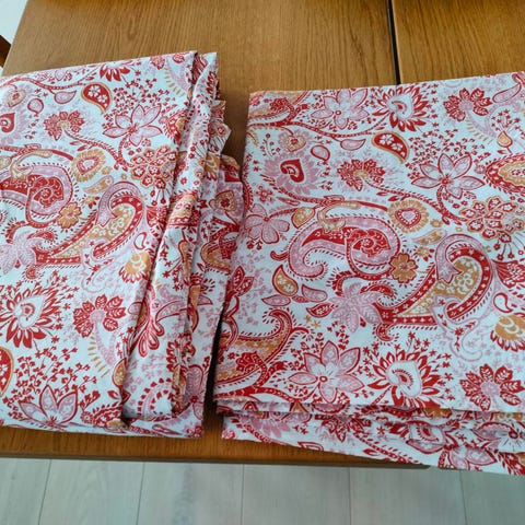 Sengetøj dobbeldyne 200x215, jeg vil tro det oprindelige mål har været 200x220. + 2x Pudebetræk. Uden pletter eller huller, fra røg og dyrefrit hjem. Bomuld.