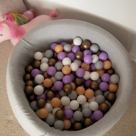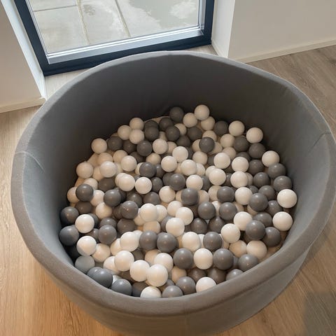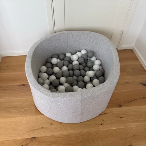 boldbassin til børn med tilhørende bolde. Bassinet er rundt og polstret med gråt tekstil på yderside og inderside. Der medfølger 200 bolde i nuancer af hvid, lys grå og mørk grå. Velegnet som legeaktivitet for mindre børn indendørs.