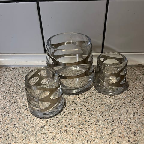 Stelton lysestager i klart glas med sort fod. Cylindrisk glasindsats monteret på rund base med plads til lys i midten. Velegnet som bord- eller vinduesdekoration og kan bruges med almindelige lys eller bloklys inden for den angivne lysholder i bunden. Sælges som sæt med to størrelser. Str 28,5 og 24,5. Der er lidt stearin på det sorte stentøj som nemt kan fjernes.