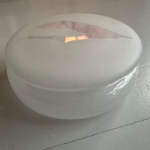 Holmegaard lågkrukke i Fiesta hvidt glas med rosa dekoration. Fiesta 1987