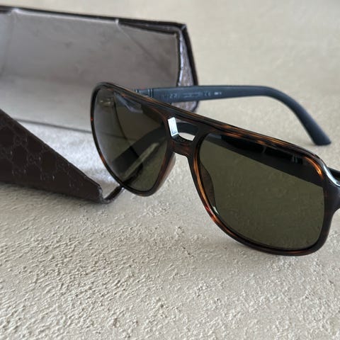 Gucci unisex solbriller i klassisk sort stel med mørke glas. Leveres med hårdt etui fra Gucci som vist på billederne.