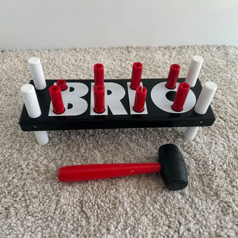 BRIO hammerbænk med tilhørende hammer. Bænken er gul med røde bogstaver og pinde i både rød og gul. Velegnet som motoriklegetøj til mindre børn, hvor barnet kan hamre træpindene gennem hullerne i bænken. Klassisk trælegetøj til indendørs brug.