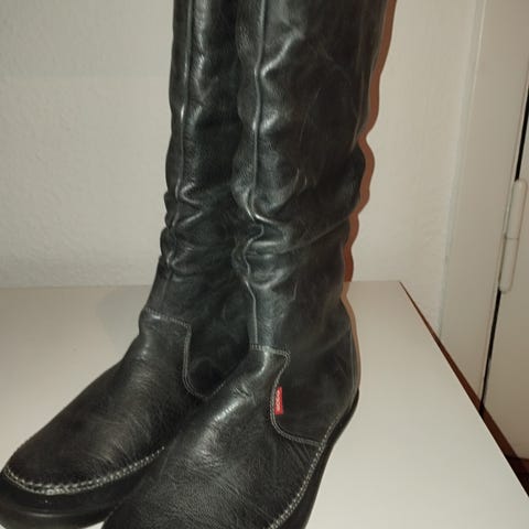 Ecco støvler i str. 38. Højskaftede brune læderstøvler med lynlås i siden og og bagpå, samt elastik for oven indvendig. Spændedetalje ved anklen. Ægte læder og ydersål i gummi. Velegnet som hverdagsstøvler i efterårs- og vinterperioden.