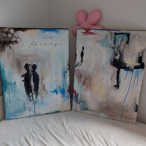 2 smukke malerier på 35 X 35 cm i lyse farver. Der er signatur på billederne, men det er ikke lykkedes os at finde kunstneren. Vi sælger dem helst samlet.