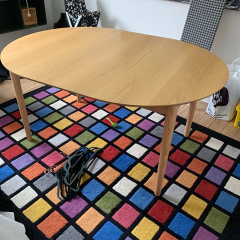 Fint lille rundt bord i flot enkelt design. Mangler lidt skruer under ben, men bordet er stabilt uden og ekstra skruer kan nok købes billigt i byggemarked ved behov.