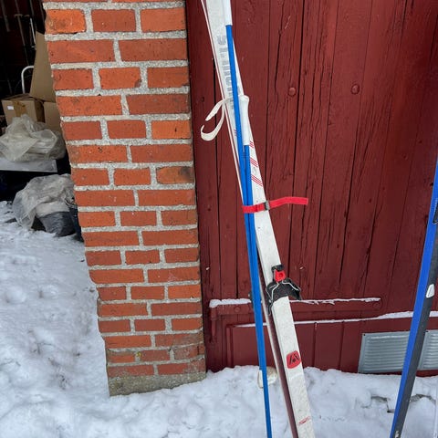 130 cm Edsbyn langrendsski med tilhørende stave. Skiene har klassiske kabel bindinger. Bemærk reparation med skrue ved den ene binding se billede)