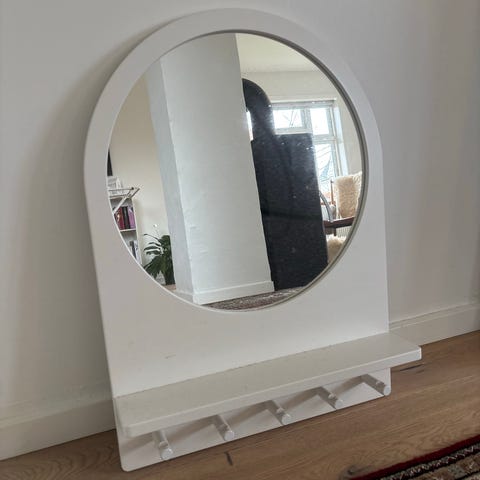Gult vægspejl med rundt spejl og integreret knagerække. Spejlet har en kraftig ramme i trælaminat og er udformet med en halvcirkelformet top, hvor det runde spejl er monteret. Nederst sidder en lille hylde samt flere knager i træ til ophæng af jakker, tasker eller tilbehør. Velegnet til entré, gang eller børneværelse, hvor der er behov for både spejl og opbevaringsmulighed på væggen.