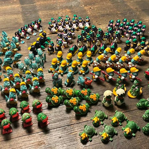 Teeny Tapsi Törtels (1991): Flere forskellige skildpadder, herunder ham med vandmelonen, skildpadden med kokosnød og ham med sneboldene.
