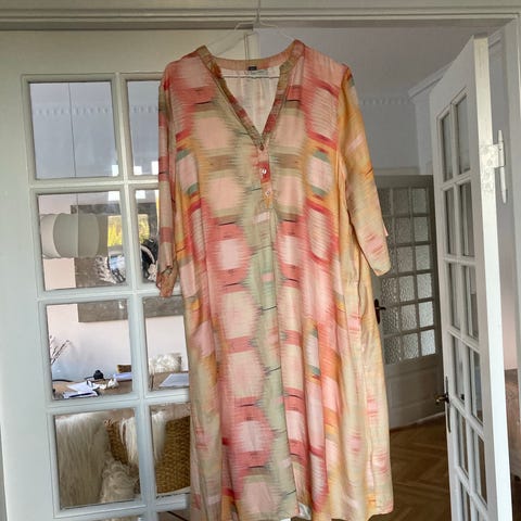 Gustav hverdagskjole i str. M. Kjolen er fremstillet i viskose og har et multifarvet mønster i mørke og lyse nuancer. Modellen har lange ærmer, v-udskæring med lille krave og knaplukning foran. Stoffet har et let, faldende udtryk, der egner sig til hverdagsbrug. Velegnet som almindelig hverdagskjole til kvinder i størrelse M. Nypris 1.599kr