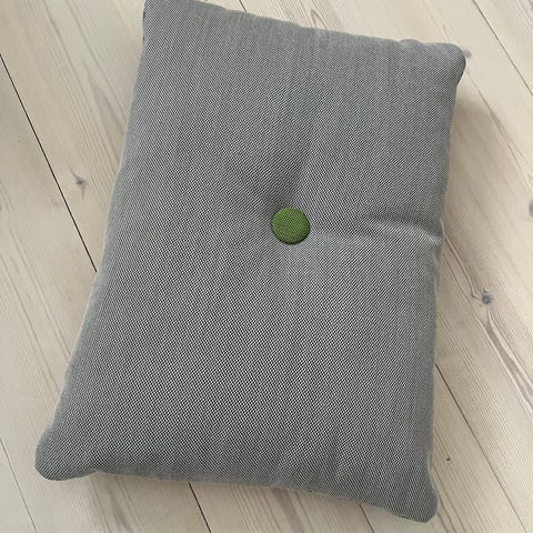 Hay pude i rektangulær form. Puden fremstår i en blålig farve med en kontrastknap i midten. Velegnet som pyntepude til sofa, stol eller seng. Tekstilmateriale og fyld er ikke nærmere specificeret.