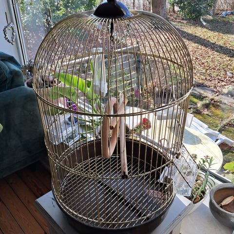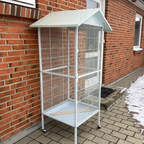 Rundt fuglebur i metal i guldfarve med en diameter på ca. 38 cm og højde på ca. 38 cm. Buret har bøjle i toppen til ophæng, aftagelig bundbakke og integrerede skåle til foder og vand. Egnet til mindre fuglearter som f.eks. parakitter eller finker. Designet giver god udsigt til fuglene og nem adgang til rengøring via åbning i siden og aftagelig bund.