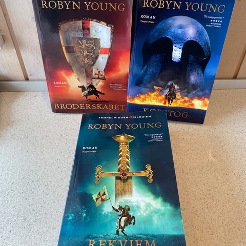 Robyn Young Tempelridder-serien bogsæt med 5 bind. Sættet omfatter titlerne: "Korstog", "Kongernes krig" (Kongebog), "Overløber", "Rige uden ende" samt et bind med tempelriddermotiv på forsiden. Historiske romaner med middelalder- og korstogstema. Alle bøger er i dansk udgave og indbundet som hardback.