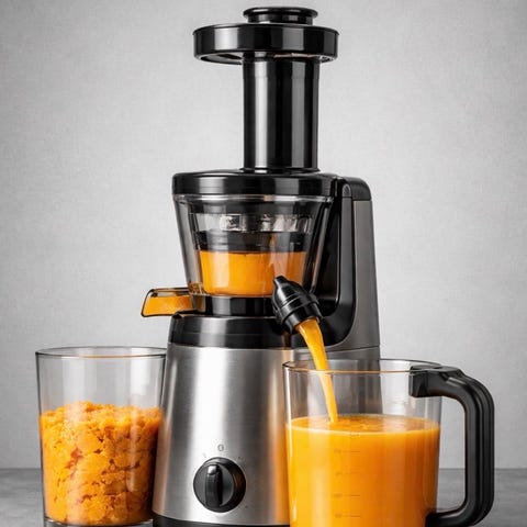 Cook & Baker slowjuicer til skånsom presning af frugt og grøntsager. Modellen er udstyret med koldpressteknologi og en pressekammer-løsning, der adskiller juice og frugtkød. Velegnet til fremstilling af juice og andre drikke baseret på friske råvarer i hjemmet.