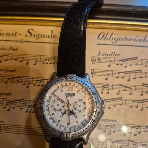 Armbåndsur med metalhus og tofarvet lænke i stål og guldtoner. Uret har rund urskive og analog visning. Egnet som hverdagsur eller til pænt brug. Mrk. Ronson. Går ikke, skal nok have nyt batteri