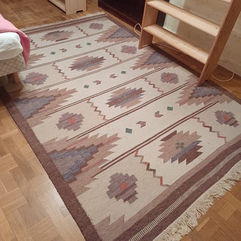 Kelimtæppe sælges. Lidt affarvet af solen, men ellers ok. Ingen røg eller dyrehår.