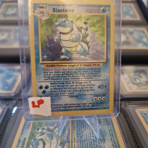 Pokémon Blastoise EX samlekort. Motiv af Blastoise i EX‑udgave med angreb som Rapid Spin og Splash Bomb. Standard Pokémon-kortstørrelse med illustreret forside og klassisk Pokémon-bagside. Egnet til samling eller spil i Pokémon Trading Card Game.