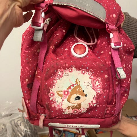 Fin og rummelig skoletaske fra Beckmann. Der er tre store rum med plads til computer. Der er også flere små rum.