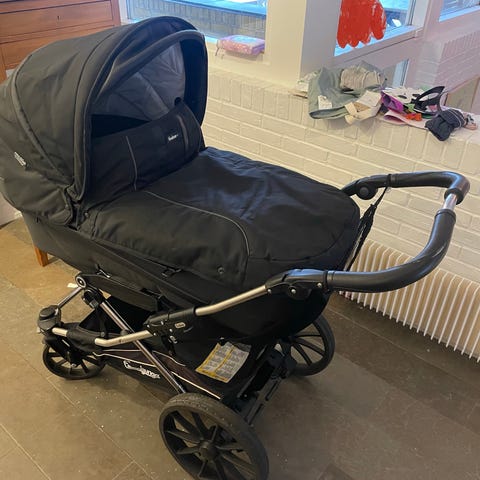 Den er købt en helt ny kaleche for 1250kr der er bon på den og har kun været brugt til et barn med masser af tilbehøre til står i Odense børnetovet