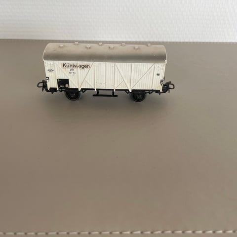 Kühlwagen model togvogn i hvid farve. Vognen er udført som en kølevogn med detaljeret ydre, herunder døre, tag og koblinger i begge ender. Egnet til modeljernbane og som samlerobjekt. Størrelse og skala fremgår ikke af oplysningerne og bør kontrolleres ved interesse.