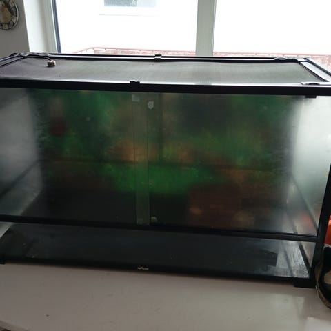 Terrarium mål 60*30*30 cm med masser af tilbehør: god bunddække, varmemåtte, termometer, hule af sten, grene, plastik planter, skelethoved mm. (har haft et større terrarium derfor al den pynt). Hentes i Lind eller Breum.
