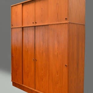 Rummeligt klædeskab I teaktræ. Det er et af de sjældne, hvor overskabene er høje. Mål: