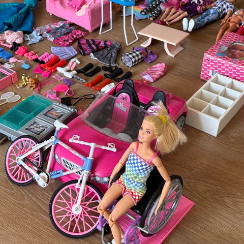 14 Barbie dukker med masser af tilbehør. Sættet omfatter også mindre dukker i forskellige outfits, kjoler, festtøj og hverdagstøj. Der medfølger desuden forskelligt tilbehør, sko, små hår- og modeaccessories, samt bil, cykel og hest.