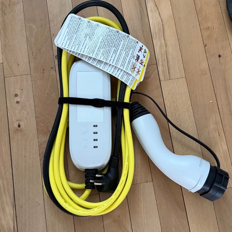 Volkswagen ladekabel til elbil med type 2-stik. Kablet har gul kabelisolering og kontrolboks (IC-CPD) på ledningen. I den ene ende er der type 2-stik til bilen, og i den anden ende et almindeligt stik til husholdningsstikkontakt. Leveres med opbevaringspose som vist på billederne. Velegnet til opladning af Volkswagen el- og hybridbiler, der bruger type 2-ladestik.
