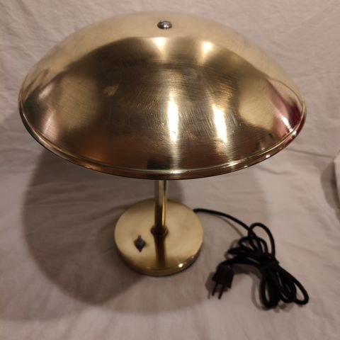 Bordlampe i messing fra 40-50’erne i Pavo Tynell stil. Men formentlig en meget tidlig Lyfa. Lampen kan pudses op hvis man ville det, men jeg syntes virkelig den er flot med sin naturlige patina.