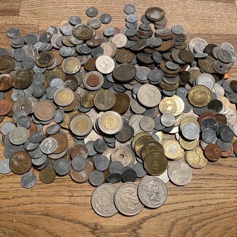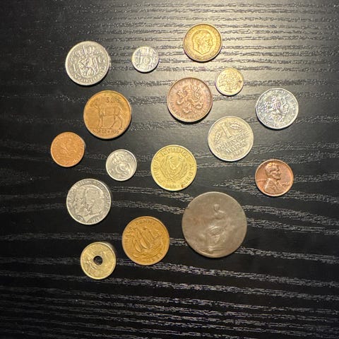Blandet parti udenlandske mønter samling. Mønterne er sorteret i separate poser med oprindelsesland markeret, herunder blandt andet USA, Belgien, Egypten, Tyrkiet, Norge, Polen, Sverige og England. Forskellige værdier, årgange og metaller indgår. Velegnet som grundlag for møntsamling eller til sortering efter lande, årstal og motiver.
