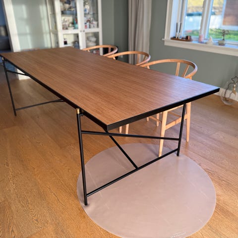 Super flot spisebord (92 x 184) fra danske Handvaerk (Emil Thorup) med stel i sorte stålrør og med bordplade i grønne marmor fliser. Fliserne kan løftes ud og skiftes til en anden farve hvis man senere vil have et andet udtryk - de kan købes seperat hos Handvaerk.