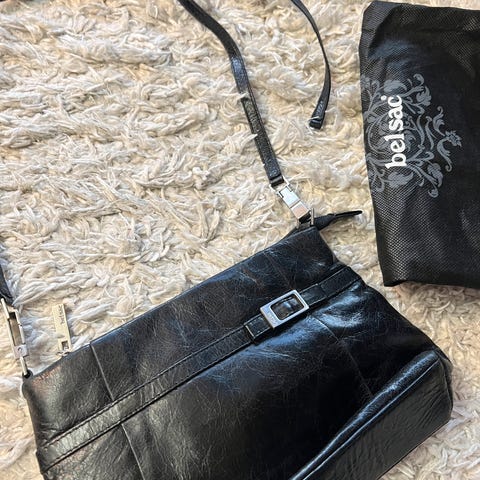 Crossbody skuldertaske fra Belsac af mrk. Jolina i blød mørkblå, rød, hvid læder. Bagpå har tasken en lynlås lomme. Indvendigt tre rum med lynlåslommer. Taskens strop er regulerbar.
