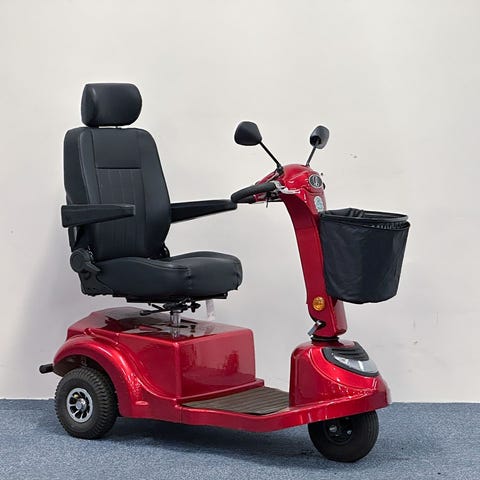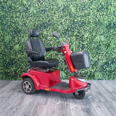 Lille og smart 3-hjulet scooter i en flot rød farve. Perfekt til besøg, korte ture byen, i butikker eller indkøbscentre. Scooteren er udstyret med en lille forkurv til bagage samt fenderliste for ekstra sikkerhed.
