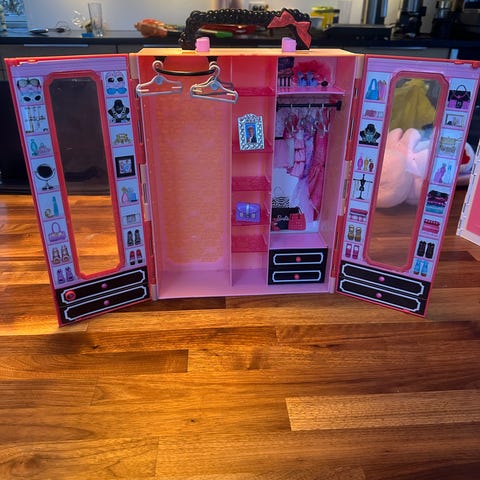 Barbie garderobeskab i plast med pink døre. Skabet har flere hylder og bøjlestang til opbevaring af Barbie-dukkers tøj og tilbehør. Egnet som dukketilbehør til leg og organisering af tøj, sko og småting til Barbie-dukker.