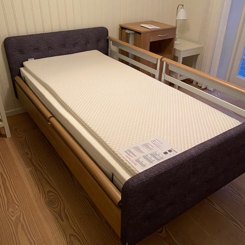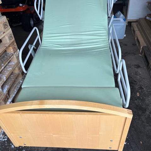 Plejeseng elektrisk med sengehest og gribebøjle. Sengen har træpaneler på sider og gavle samt metalramme. Den er udstyret med elektrisk højde- og liggefladejustering, som styres via håndbetjening med fem forskellige funktioner til justering af hoved- og fodende. Der medfølger sengeheste i træ på begge sider samt gribebøjle/løftebøjle monteret på en metalstang ved hovedenden. Madrassen er enkeltsengsstørrelse. Sengen er egnet til pleje eller som almindelig elevationsseng.