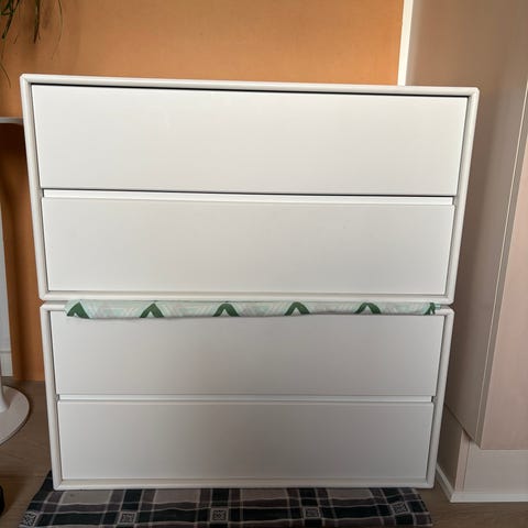 Montana skab med låger på hjul i hvid. Skabet har to låger på fronten og er indvendigt opdelt i fire lige store rum med faste hylder. Det står på fire hjul, som gør det let at flytte rundt. Vægbeslag medfølger. Nypris DKK 6.880,-.
