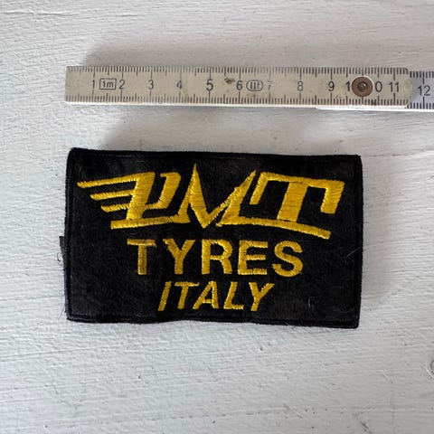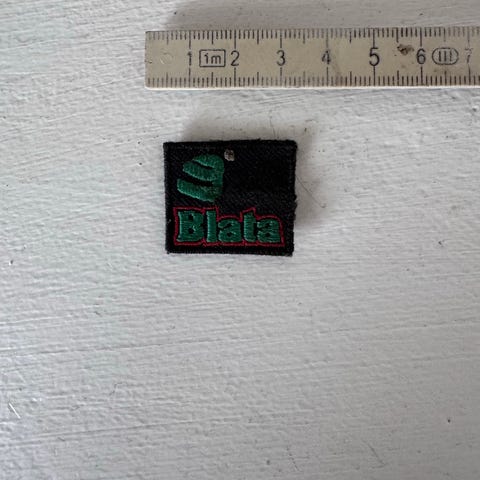 Blata stofmærke i sort med grønt og rødt logo. Mærket er kvadratisk og måler ca. 6 x 6 cm, som angivet ved linealen på billedet. Velegnet til påsyning på tøj, jakker, tasker eller andet udstyr. Fremstillet som broderet stofmærke med Blata-logo på forsiden.