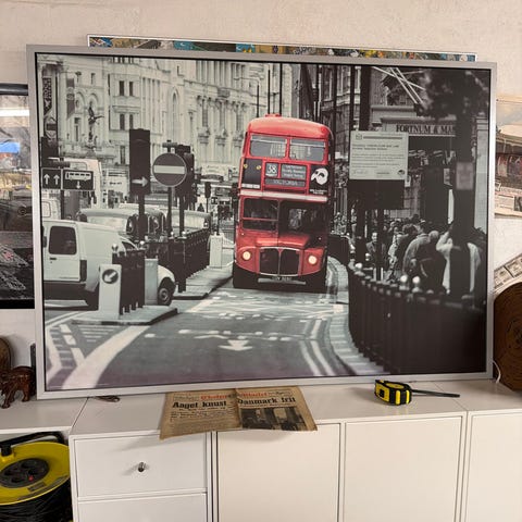 Stort Vægbillede med motiv af en london-gade med rød dobbeltdækkerbus i farve og omgivelser i sort/hvid.