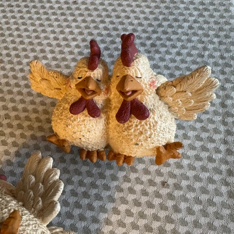 Salt og pebersæt sælges. Gammelt så patina kan forekomme. Sød kylling med påskeæg. Ingen skår. Sender gerne. Sælges som samleobjekt