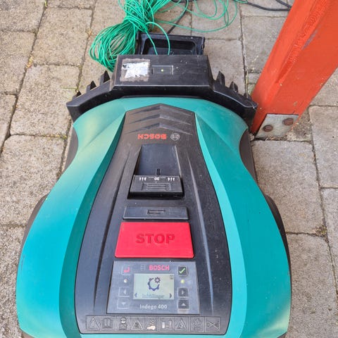 Garden robotplæneklipper i grøn. Modellen er en automatisk plæneklipper til vedligeholdelse af græsplæner. Maskinen har roterende knivsystem i bunden med flere knivblade monteret på en rund skive. Overdelen har låg med betjeningsknapper og sikkerhedsanvisninger. Velegnet til automatisk klipning af græs i haver, hvor robotten kører selvstændigt inden for et afgrænset område efter korrekt installation af systemet.