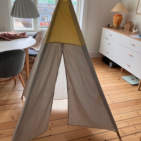 IKEA legetelt i røde og hvide striber med blå åbning. Teltet er formet som et cirkustelt med lille flag på toppen. Velegnet som indendørs legetelt til børn, hvor det kan bruges til rolleleg og som lille hule. Fremstillet i tekstil med let stel, der kan samles og skilles ad efter behov.
