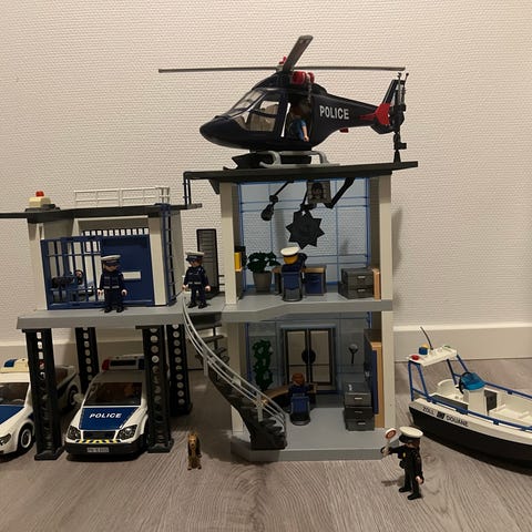 Politistation med fængsel, Arrest med celle, 2 politibiler, 2 helikopteren, brandbil og meget tilbehør til det hele bl.a. betjente ,røver,kontor og diverse ting man bruger Ved den ene bil er det kun lysglimt. Den lille helikopter er defekt ved haleror. Pris for det hele . Evt forsendelse aftales