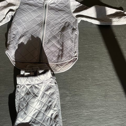 Wheat termotøj sæt i str. 92 til unisex. Sættet består af jakke og bukser i sort polyester med mønster. Jakken har lynlås foran og ribkanter ved ærmerne. Bukserne har elastik i taljen og rib ved anklerne. Materialet er 100 % polyester, herunder genanvendt polyester ifølge mærket. Sættet er egnet som praktisk lag-på-lag tøj til køligere vejr.