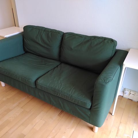 Super fin 2-personers sofa fra ikea. Meget behagelig. Den har to steder, hvor den er lidt mørkere. Har ikke forsøgt at vaske.