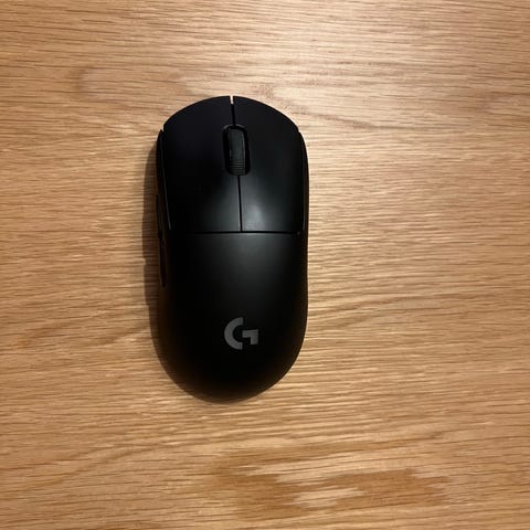 Logitech G Pro trådløs mus i sort. Musen er designet til computerbrug og har et kompakt, symmetrisk design med to hovedknapper, scrollhjul og ekstra knapper på siden. Egnet til brug sammen med stationær eller bærbar computer, f.eks. til kontorarbejde eller gaming, afhængigt af brugerens behov.